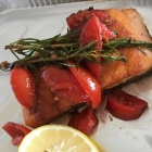 Der Lachs war auf der Haut gebraten. Die Hautseite lag unten. Zur Aromatisierung waren Rosmarin und Zitrone beigefügt worden.