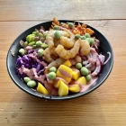 Meine Entscheidung fiel auf eine der vorgefertigten Variationen. Mit nur einer von mir gewünschten und auch problemlos gewährten Änderung enthielt der "Niihau"-Bowl in der kleinen Portion also Garnelen mit Soja-Knoblauch-Marinade, denen der von mir gewünschte Quinoa statt Salat als Basis beigefügt werden sollte. Weitere Zutaten waren Edamame, Mango, Rotkohl, rote Zwiebeln, Karotten. Eine rote-Bete-Mayonnaise übernahm den Saucen-Part, während Wasabi-Erbsen als Topping dienten.