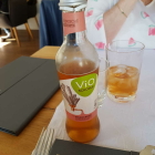 Der Service brachte kurz vor zwölf Uhr die mittlerweile fertiggestelle Tagesmenü-Karte an den Tisch und erfragte unsere Getränkewünsche. Meine Frau nahm wie gewohnt "ihren" Averna auf Eis (EUR 4,50) und zum Essen eine kleine Flasche Teinacher (0,25l EUR 3,00). Ich entschied mich diesmal für einen Auxerrois (Karaffe 0,2l EUR 9,50) von meinem Elsässer Lieblingswinzer Armand Gilg aus Mittelbergheim, der ansonsten wunderbare Rieslinge hat, die hier leider nicht auf der Karte stehen. So richtig geschmeckt hat mir der Auxerrois aber nicht; beim nächsten Besuch nehme ich lieber wieder den Pfälzer Riesling vom Weingut Mussler.