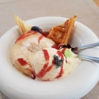 Meine Herzallerliebste entschied sich für das Tagesmenü, das je nachdem was der Gast sich unter drei Vorspeisen, sechs Hauptgerichten und zwei Desserts auswählte, zwischen EUR 35,00 und EUR 49,00 kostete; sie war mit EUR 45,00 dabei. Als Vorspeise hatte sie sich für die "Kartoffel-Bärlauchsuppe mit Krabben, Saibling und Ofencrustinis" entschieden. Ihr Hauptgericht war "Rumpsteak und Kalbsbäckchen mit Pilzen und Pommes Frites" und als Dessert kam für sie "Eine Kugel Eis/Sorbet mit Schlagsahne". So ganze 100 Prozent zufrieden war sie mit ihrer Wahl nicht; es wurde ein klein wenig gejammert auf sehr hohem Niveau. "Bei meiner geschmacklich einwandfreien Suppe hätte ich den Saibling nicht gebraucht und die Kräuterkruste auf meinem Rumpsteak, das eine kleine Spur über medium rare drüber war, war mir etwas zu senflastig". Ansonsten war sie aber sehr zufrieden und am besten gefiel ihr das von ihr ausgesuchte Dessert. Das Eis war ein Basilikum-Minze-Eis und der absolute Hammer; dass so etwas schmecken würde, hatte ich persönlich mir nicht vorstellen können, aber mein "Kostelöffelchen" überzeugte mich absolut. Nicht unerwähnt bleiben sollte, dass es zu Beginn als Amuse Bouche das uns schon hinlänglich bekannte Ingwer-Möhrensüppchen mit der tomatenbelegten "Minipizza" gab; hier täte ein wenig Abwechslung mal ganz gut. Zwischen Vorspeise und Hauptgericht servierte man uns ein Blutorangen-Rotwein-Sorbet; geschmacklich allererste Sahne, obwohl keine Sahne dran war.