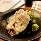 Der Seidentofu, ganz fein mit Tempurateig umhüllt in einem würzigen Dashi serviert, war für meinem Geschmack entweder zu groß oder zu kurz frittiert worden. Jedenfalls war das Innere noch recht kalt. Vielleicht „muss“ das ja auch so und ich habe bislang immer nur armselige Nachahmungen bekommen. Aber egal, mir hätte es besser geschmeckt, wenn es durchgehend heiß gewesen wäre. Dafür kam ich in die Genuss einer kurz gegrillten, milden Chilischote und zweier knackiger Garnelen. Fein geriebener Rettich und etwas Misopaste sind Standard.