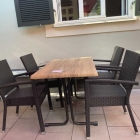 Es gibt Tische mit brauner Kunststoffplatte. Die Stühle bestehen aus schwarze Art Rattanstühle. Auf manchen Tischen gibt es einen Aschenbecher und Zettel mit Reservierung.