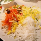 Der körnig-lockere Kabuli Palau, eine Art afghanischer Pilaw-Reis, der mit karamellisierten Karotten, Rosinen, Mandeln und Pistazien garniert war, wurde um einen ordentlichen Safran-Basmati-Reishügel erweitert. Dazu gesellte sich eine mit Pfefferminz und Knoblauch verfeinerte Joghurtsauce, die sich zwischen Reisbeilage und Grillfleisch ziemlich wohlfühlte und in einer separaten Schale geliefert wurde.