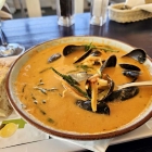 Im Gegensatz zu meiner Frau, die es bescheiden bei einem Hauptgang beließ, konnte ich der angebotenen Muschelsuppe als Vorspeise nicht widerstehen - zum Glück! Denn der gute Fischfonds war kräftig, aber nicht überwürzt oder gar versalzen und hatte gerade genug Tomatensäure, um dem zarten, weder breiigen noch zähen Muschelfleisch die Schau zu stehlen. Knackiger Queller passt sowieso zu fast allem aus dem Meer, die Gemüse-Julienne. hatten noch etwas Biss und auch das frische, knusprige Baguette verdiente Lob. So blieb kein Tropfen der leckeren Suppe übrig.
