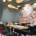 Ratzfatz erscheinen die Teller, mit üppigen Portionen, die wir erst für ein Versehen halten. Na gut, war Ramen nicht ursprünglich ein Arme-Leute- und Malocher-Essen? Etwas irritierend ist allerdings der unterschwellige Chlorgeschmack. Stammt er von der Ente oder von den Nudeln? Letztere sind ziemlich schlüpfrig, soft und unendlich lang, so dass man sie sich am besten traditionell schlürfend einverleibt, wenn sowohl Stäbchen, als auch vorsorglich dazu serviertes Besteck versagen. Kein Wunder, dass die Wände nur so vor Flecken strotzen. Beim Entengericht sorgt die knusprige Haut immerhin noch für rezenten Geschmack, doch die Tomate-Rührei-Variante wäre eher etwas für kleine Kinder oder zahnlose Greise. Kräftig aufpimpen mit einer Sambal- Oelek-artigen Würzsauce (die zusammen mit Essig auf jedem Tisch steht) muss man jedoch beide Portionen. Wir spülen so viel wie möglich mit einem alkoholfreien Weizenbier (4,50 Euro für den halben Liter) und einer Cola zero (3,90 Euro für die 0,33 Liter-Flasche) hinunter, müssen am Ende jedoch um eine Mitnahmemöglichkeit für die Reste bitten. 1 Euro soll für die Box berechnet werden, dem wir zerknirscht zustimmen. Auf der Rechnung taucht dieser Posten dann allerdings doch nicht auf. Wir sind nicht die Einzigen, die das Lokal am Ende mit einer voluminösen Lieferando-Papptüte verlassen, aber vermutlich eine der Wenigen, die sich heimlich dafür schämen. Erst jetzt fällt mir übrigens auf, dass ich nirgendwo das für diese Location namensgebende Sushi entdeckt habe. War vielleicht heute einfach nicht angesagt – beim übrigens hauptsächlich asiatischen Publikum. Der Service wiederum scheint multikulti besetzt zu sein und ist sehr hurtig und flink bei der Sache.