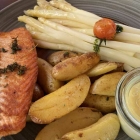 Im Detail möchte ich nur auf das eingehen, was meine Frau und ich gegessen hatten. Preise kann, wer will, der Website des Hauses entnehmen. Allerdings ist die Spargelkarte dort nicht zu finden; ich glaube mich aber zu erinnern, dass die Spargeln mit gebratenem Lachs, die meine Frau bestellt hatte, in den höheren Zwanzigern lagen. (Irgendwie läuft es bei ihr immer wieder auf Lachs heraus, sie ähnelt in dieser Hinsicht kgsbus‘ Tante, wenn auch nicht in dieser Ausschließlichkeit.)
