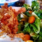 Da ein Amuse offenbar zu old-school ist, startete ich meine Soulfood-Reise mit frittierter Softshell-Crab, deren Panko-Panade wunderbar knusperte. Die nach der Häutung noch mit einer weichen bis leicht brüchigen Schale ausgestattete Krabbe wurde in eine selbstgemachte Majonäse gestippt, bei der mir das Piment d‘Espelette besser gefiel, als die sehr starke Limettensäure. Als frischer Ausgleich kam ein gemischter Blattsalat mit dreierlei Mini-Tomaten, die geschmacklich völlig überzeugten! Dazu ein fruchtiges Cranberry-Dressing.