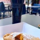 Ein große, ganz sicher selbst gefertigte Teigtasche, lecker gebräunt und mit Puderzucker bestäubt, schön dünn und daher mit leichtem Knusper gesegnet. Schon für sich genommen ein Genuss. Als Füllung Rinderhack, würzig und süß, möglicherweise mit Mole, dazu noch Ei und schwarze Olive. Kein bißchen trocken und extra gut abgeschmeckt.