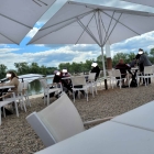 Anmeldung am Eingang und zum Reservierten Tisch geleitet worden. Der Hauptweg führt über Holzbretter und über grobe Kieselsteine geht es meistens zu den Tischen, das ist für manche nicht ganz unbeschwerlich. Die Bestuhlung mit dem Kunststoff bezogenen Sitz und Rückenteilen waren für uns OK. Es gibt aber auch Liegestühle und für die Kids einen eigenen Spielbereich. Das Lokal im inneren hatten wir mit dem Tresen Bereich bei dem Wetter nicht in Anspruch genommen.