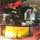 Die Theke befindet sich auf der linken Seite und rechts daneben sind ein paar Sitzplätze. Die Wände sind gekachelt und hinten an der Wand befindet sich ein großer Bildschirm und dort laufen indische Programme ab (Musik und Tanz).