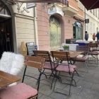 Zur Straße hin ist es durch Blumen etwas abgegrenzt. Es hängen auf ein paar Stühlen Decken drüber und es gibt Sitzkissen.