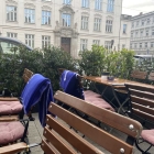 Es gibt die typische Biergartenbestuhlung mit den Klappstühlen und Tischen in braun. Es ist alles allerdings schon sehr abgenützt.