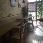 Es gibt verschiedene Tischgrößen aus hellem Holz und passende Stühle dazu. An den Wänden hängen ein paar Bilder.