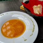 Glücklicherweise war die Suppe trotzdem geschmacklich nicht neutral. An Würze und leichter belebender Schärfe ließ die sämige, rote Essenz es nämlich nicht vermissen. Gleichzeitig ging das geschmackliche Spektrum über die sahnige Sämigkeit aber nicht hinaus. So fehlte es mir klar an einer erhofften, vollmundigen Fruchtigkeit. Auch ein typisches Aroma aus dem italienischen Kräutergarten trug sich nicht als Beweis für hausgemachte Frische hervor. Da hätte das Pesto doch eher vom Tellerrand in die Suppe fließen sollen.