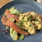 mit hausgebeiztem Lachs, Matjesfilet, Lachstatar und Grönlandcrevetten. Sehr guter Matjes, das war der erste Eindruck. Je weiter man sich von der niederländischen Grenze entfernt, desto mehr wird es Glücksache, ob der Matjes ein guter ist (nur in Glückstadt gibt es laut meinen niederländischen Kollegen noch annehmbaren deutschen Matjes). Zurückhaltend war eine Sahnesauce dazu gegeben, Hausfrauen Art (darf man das noch schreiben als politisch korrekter Mensch?) mit Gurke und Apfel. Die Crevetten waren sehr kalt, fast zu kalt, und mit einer Cocktailsauce versehen, das war zusammen genommen der schwächste Teil des Tellers. Relativ fade und langweilig war das. Sehr gut dann wieder die beiden Lachsgerichte. Ein kräftig mit Dill versehenes Tartar machte dem Gaumen Spaß. Noch besser aber der gebeizte Lachs mit ein bisschen honig-süßer Senf Sauce. Lecker! Ein kräftiges Sauerteigbrot mit Butter wurde dazu gereicht und ich war zufrieden.