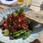 Aber das kann Rantum nur gut tun, wenn wieder etwas mehr junge und lebhafte Leute den Ort aufsuchen. Wie schon gesagt, die Karte lässt sich auf der HP einsehen. Und natürlich hatten wir schon vorher geschmökert im Angebot. So dauerte es nicht allzu lange, bis wir der jungen Dame unsere Speisewünsche mitteilen konnten, ebenso wie eine Flasche Wein und Wasser als Begleiter zu den ausgesuchten Speisen. Wer die Karte studiert, stößt auf ein Angebot, dass sich nicht festlegen lässt in seiner Ausrichtung, außer dem Ausschluss aller Standardgerichte a la Schnitzel-Pommes-Salat Variationen. Das gefiel uns ausnehmend gut.