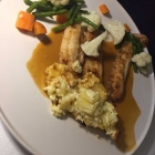 Überraschung war dann der servierte Teller Fisch, es war Seezungenfilets an Hummersauce mit Möhre, Blumenkohl, grünen Bohnen mit Kartoffelgratin, von Senfsauce, Polenta & Spinat keine Spur auf dem Teller. Der Soll-Ist Vergleich für 19,50 € war enttäuschend. Meine Tagliatelle mit blassen Lachsstückchen schmeckte, machte aber auf dem Teller auch für