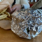 Hot Dog und Burger wickelt man peu à peu aus Alufolie. Die Pommes befinden sich natürlich in einer weiteren Tüte, und der Milkshake in einem Wegwerfbecher. Vielleicht hat man ja mit der Müllabfuhr einen Rabatt aushandeln können…