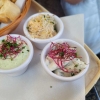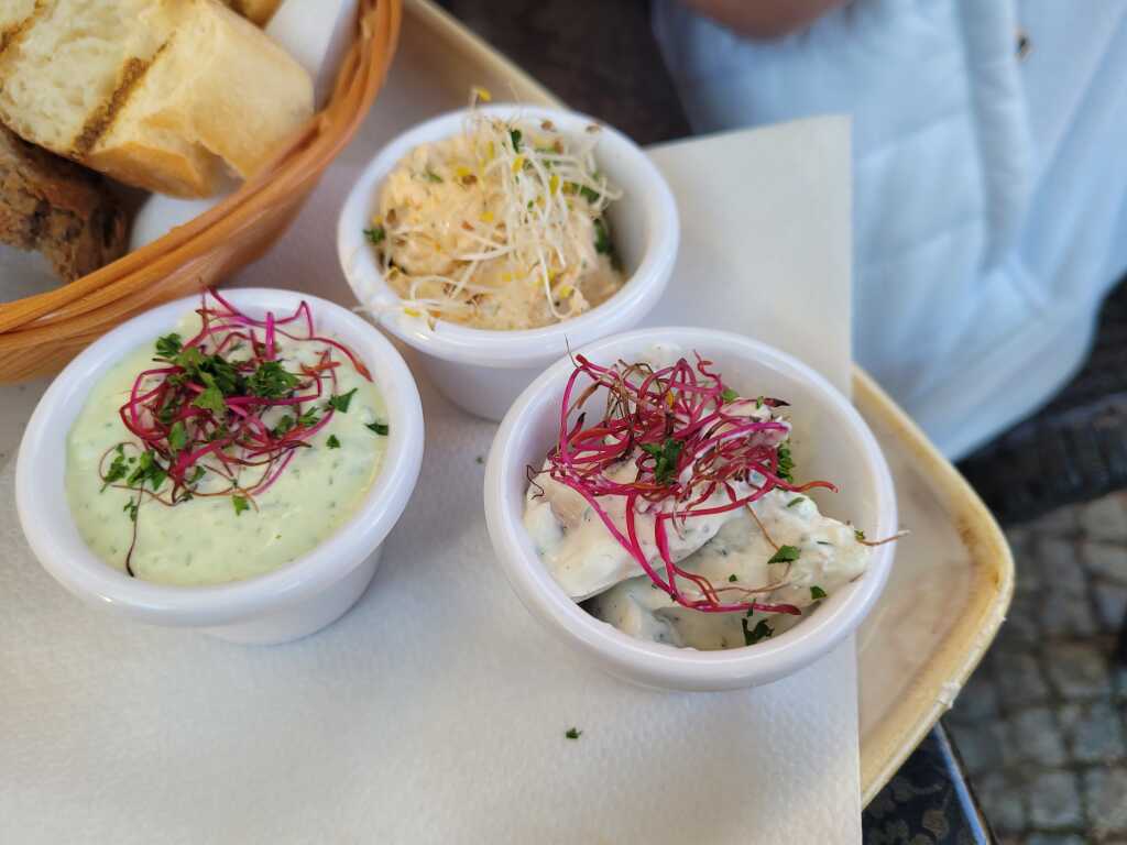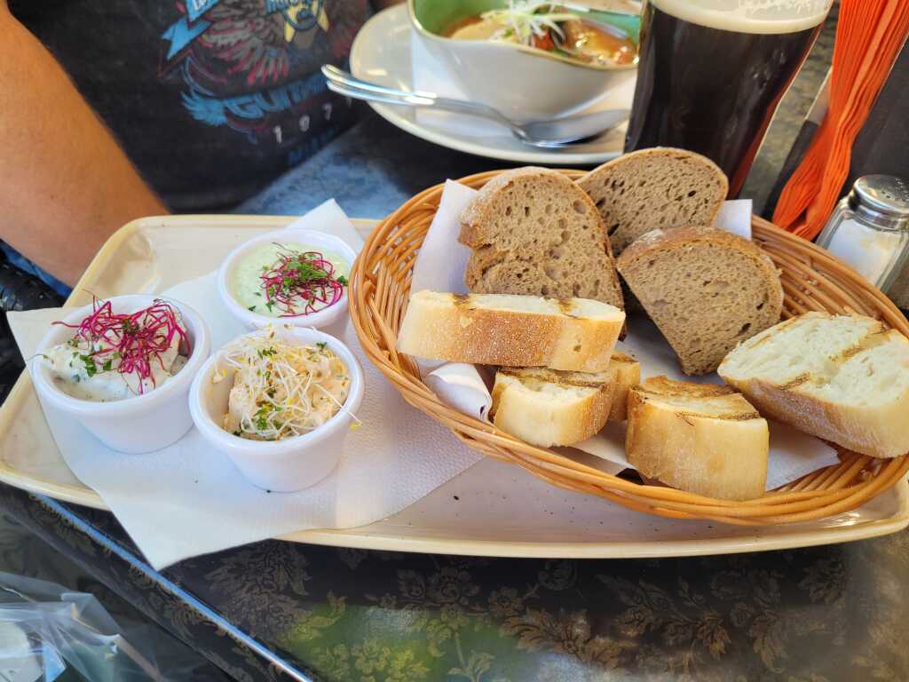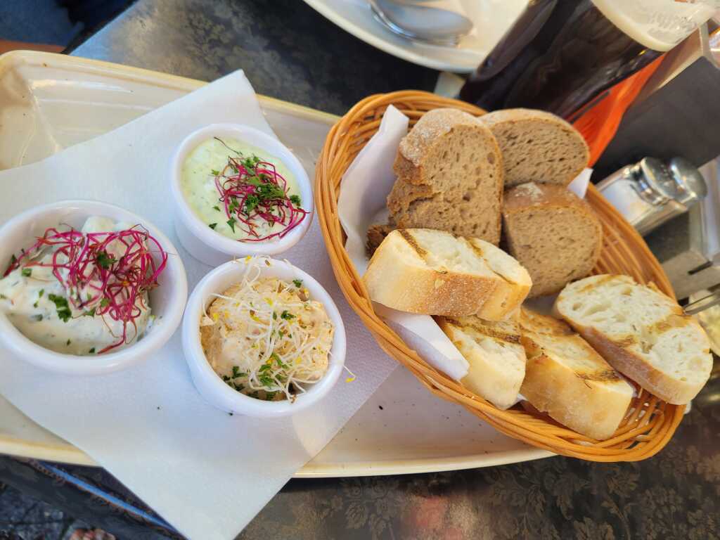 Brot und Baguette hatten hier auch den Anschein aus der Großbäckerei zu kommen. Dafür waren die Dips wahrscheinlich selbst angerichtet. Diese bestanden aus einem erfrischenden Aioli – Dip mit Kräutern, einem herrlich cremigen Kräuterquarkdip sowie einem sehr herzhaften, leicht scharfen Paprika-Frischkäsedip. Letzterer war mit Feta vermischt und kleinen Chilistückchen versetzt. Zum dippen zum Bier völlig ok.