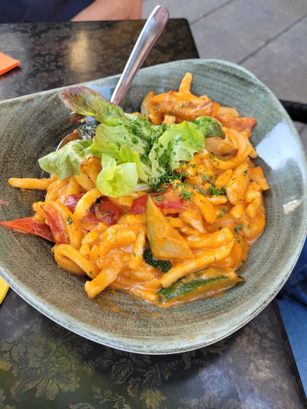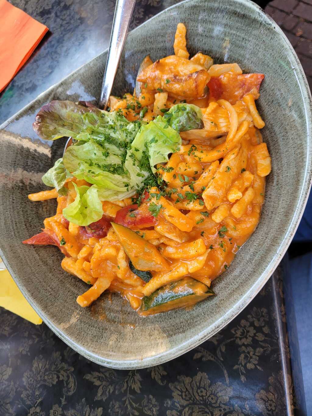 · 1x Shamrock Spezial – Spätzlepfanne mit gebratenen Hähnchenstreifen, Zucchini, Paprika und Zwiebeln in einer Tomaten-Sahne-Soße für 19,90 €