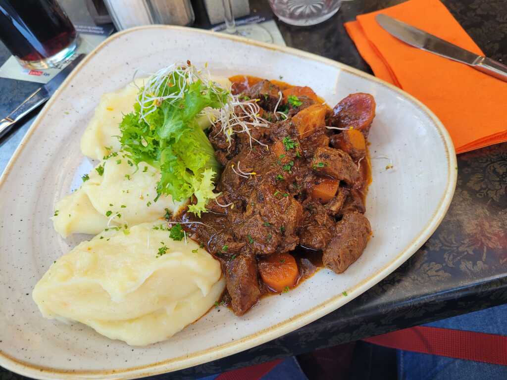 Dazu wurden in dem Gulasch Möhren- und Selleriestückchen mitverarbeitet, welche sich so richtig schön mit dem Aroma des Gulaschs vollgesogen hatten. Dazu gab es Stampfkartoffeln, wobei ich allerdings sagen muss das es wohl eher „Rührkartoffeln“ waren, denn von gekochten und gestampften Kartoffeln war dieser Stampf weit entfernt. Hier wird wohl eher fertiges Pulver eingerührt.