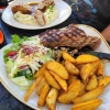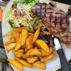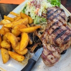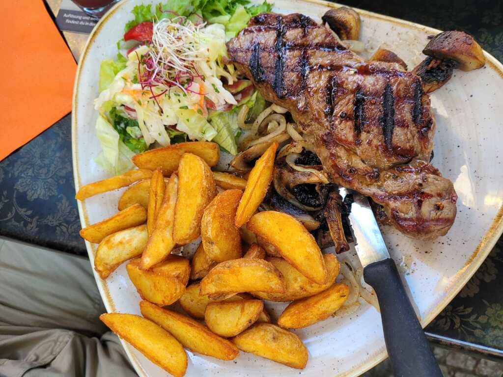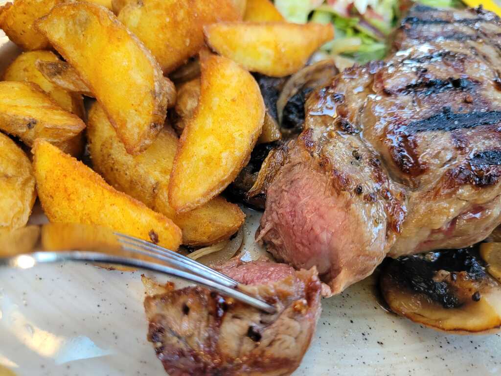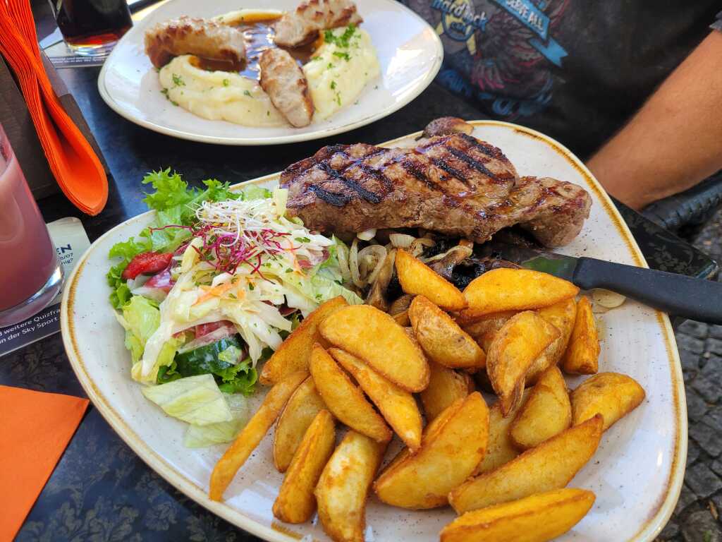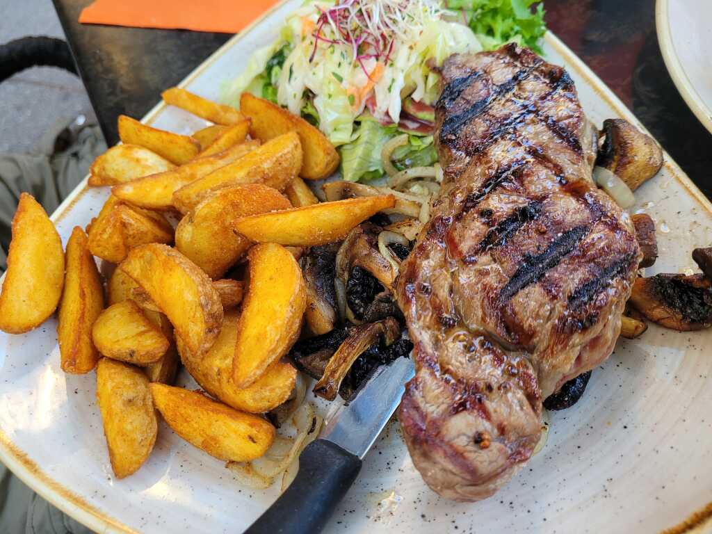 Hatte er doch ein schönes großes Rumpsteak auf seinem Teller. Gut gewürzt mit reichlich Knoblauch und ordentlich gegrillt. Die Grillspuren waren deutlich zu sehen. Leider wurde nicht abgefragt welche Garstufe er möchte, und so war es dann in medium well gebraten.