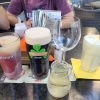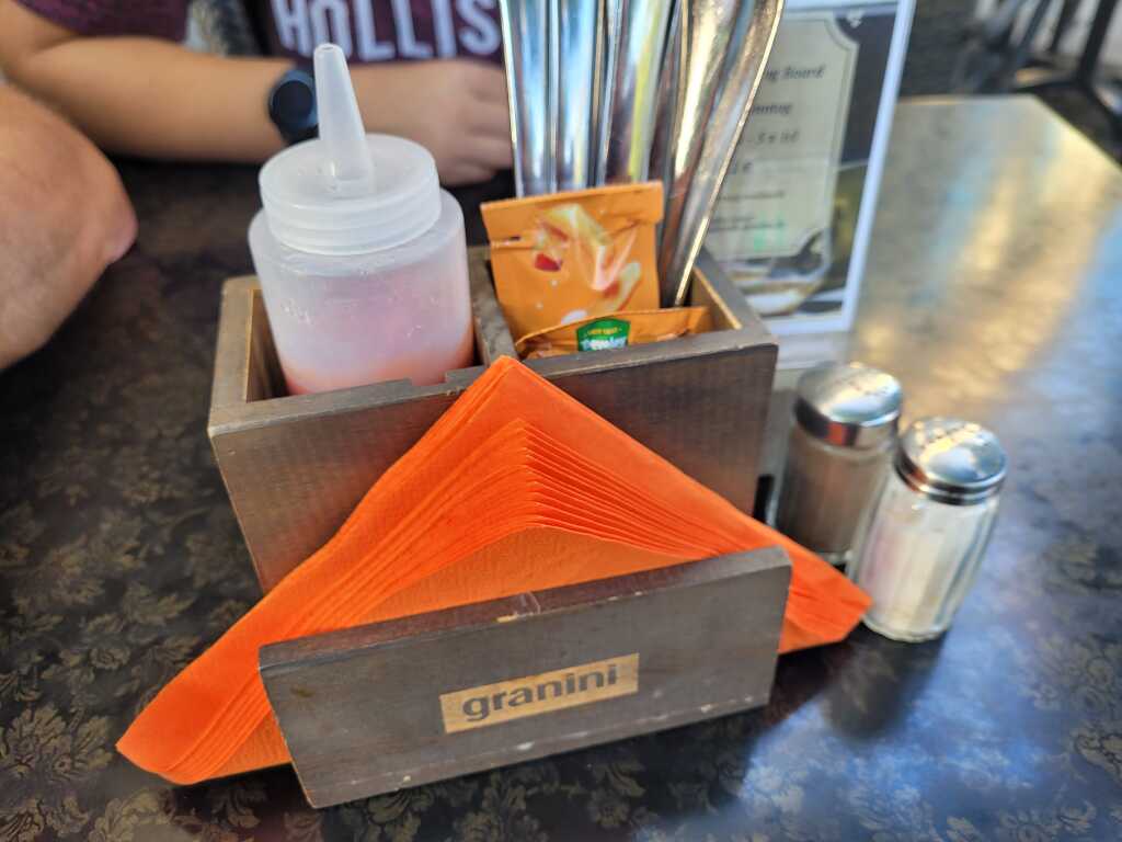 Auf den teilweise wackligen Tischen (durch das Kopfsteinpflaster darunter) gab es den üblichen Salz-und Pfefferstreuer, eine Chilisauce in der Flasche und Senf in der Portionstüte. Auch das Besteck war in dieser Box verstaut. Servietten standen in einem kleinen extra Halter bereit.
