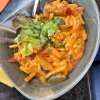 Sie ist schon eine, die ihr Essen nur warm und nicht heiß mag, aber wenn sie dann sagt das ihr Essen nicht unbedingt warm ist. Oh je. Zurückgeben wollte sie aber auch nicht, da sie dann schon ahnte das es ja eh bloß in der Ping aufgewärmt wird. Auch war es ihr am Ende zu klanschich, so als ob die Spätzle schon lange in dieser Soße lagen. Die Hähnchenstreifen musste sie suchen, auch von Zucchini und Paprika war nicht allzu viel vorhanden.