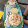 Da standen dann bei ihr ebend als Vorspeise zwei Schälchen mit diesen gebackenen Apfelstücken vor ihr. Dazu eine Vanillesoße, von der man leider nicht deutlicher sehen und schmecken konnte das diese aus der große Tetrakonserve kommt. Die Apfelstücken waren aber gut, und nicht zu süß.
