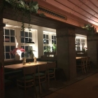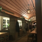 Es gibt hier eine Biergartenbestuhlung aus braunen Klapptischen und Stühlen. Was wir schön fanden dass es hier Stühle mit einer Armlehne gibt. Sitzkissen wären noch schön. Auf dem Tisch gibt es einen Krug mit Besteck und Servietten und einmal eine Karte.