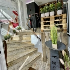 Nach Eintritt müssen leider eine Handvoll Stufen erklommen werden, zu denen mir aktuell zumindest noch keine offensichtliche Alternative für mobilitätsbeeinträchtigte Personen vorzuliegen scheint. Dabei wird man aber gleich von vielen Blumenkübeln und einer Wandmalerei begrüßt.