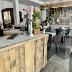 Neben einem Empfangstisch gleich links vom Eingang bildet auch eine, sogar mit kleinem „Dach“ optisch aufgehübschte Bar auf der gegenüberliegenden Seite das Hauptelement neben den zahlreichen Zweiertischen. Diese sind, passend zum Boden, in schwarz gehalten. Eine Verbindung zur weißen Wand-Grundfarbe und den weißen Gardinen bildet in gelungener Art jeweils ein heller Tischläufer.