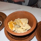 Eine ukrainische Spezialität sind gefüllte Teigtaschen, die in vielen Küchen zuhause sind. Hier heißen sie Wareniki und wurden einmal mit Kohlfüllung (10,00 Euro, Internet: 11,00 Euro) und einmal mit Hackfleischfüllung (11,00 Euro, Internet: 14,00 Euro) von der Frauenseite des Tisches bestellt. Dazu gibt es vier Beilagen: Zwiebeln, Speck, Schmand und Barbecuesauce. Die jeweils fünf Wareniki wurden in Tonschalen serviert. Leider, bemerkte meine ständige Begleiterin, ohne Brühe. Also eine eher trockene Angelegenheit, die aber geschmacklich für in Ordnung befunden wurde. Mein Bissen der Hackfleischvariante war langweilig; Hackfleisch kann man gschmackiger würzen (in der Schwiegerelternfamilie werden die Kolduny-Teigtaschen mit Schweinehack, Zwiebeln und Majoran gewürzt).