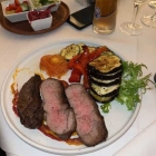Mein Mitesser links musste ja erst einmal zugucken und bekam nach energischer Mahnung sein Roastbeef mit Grillgemüse (24,00 Euro). Als der Teller mit den drei stattlichen Tranchen vor ihm stand, war für mich klar: nicht heiß und trocken, was mir dann auch bestätigt wurde. Das war des Fleisches unwürdig, was die Küche meinem Nachbarn zugemutet hat.