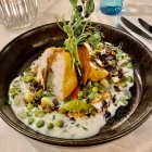 Dies thronte nun auf dem klar erkennbaren „Schnüsch“ der auch hier ein Allerlei von Erbsen, jungen großen Bohnen, langen Bohnen und Möhren- bzw. Kohlrabischeibchen in einer cremiger, hellen Sauce. Das Gemüse war allesamt knackig und auf den Punkt gegart und die Sauce hatte die genau richtige Konsistenz. Das ergänzte das krosse Huhn optimal und machte diese „Tapas“ zu einer wahrlichen Wohlfühl-Vorspeise.