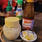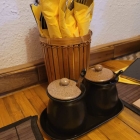 Ansonsten ist der Raum mit viel Pflanzen, Buddhafiguren ausstaffiert und wird mit heimeligem Licht beleuchtet. Naja, wer´s mag. Dafür war aber alles außerordentlich aufgeräumt und anscheinend auch sauber. Auf den Tischen standen noch diverse Spender mit Saucen unterschiedlichster Schärfe, eingelegtem Knoblauch und Zitrone sowie dem allseits bekannten Sambal Olek.