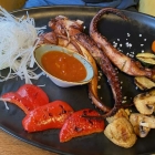 Schließlich wurde auch mein Oktopus an den Tisch gebracht, und zwar in Form von drei kräftigen Armen, von der Schulter bis zur Fingerspitze. Wie schon beim Thunfisch hatte auch hier der Mann am Grill Hervorragendes geleistet: Von außen kräftig angeröstet und innen noch zart, nur die dünnen Enden waren naturgemäß kross geworden. Zusammen mit dem Grillgemüse eher mediterrane als asiatische Küche, ähnlich wie der Thunfisch.