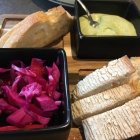 vorweg: Brot und eingelegter Heringhappen mit Dip