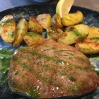 Die Bratkartoffeln waren als halbe Stücke mit Haut gekocht und dann leicht gebraten worden. Das kann man so machen. Selber habe ich lieber dünne Scheiben, die außen recht kross sind und nur innen leicht weich.