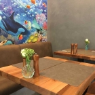 Die Ausstattung ist innen recht gut ausgefallen. Die Wände sind grau gehalten und allerlei Meeresgetier ist reliefartig stellenweise abgebildet. An einer Wand ist ein farbiges Unterwasserbild dargestellt und auf dem Weg zu den Sanitäranlagen sieht man eine Siedlung am Wasser.