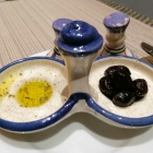 Auf dem Tisch eine Schale mit schwarzen Oliven. In der Vorkritik gab es noch Olivenöl, bei uns Fehlanzeige. Auf dem Tisch keine Gewürze. Im Korb billigstes Fladenbrot vom Türkenbäcker.