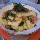 Auch hier wieder der Dorsch butterweich, außen kross gebraten und mild gewürzt, sodass der Dorschgeschmack und das zarte, feste weiße Fleisch des Dorsches voll zur Gelzung kam. Auch die Limetten-Zucchinicreme, mit welcher die Bandnudeln leicht bedeckt waren, schmeckte gut. Nicht zu stark, sodass der Geschmack vom Fisch und den Bandnudeln nicht übertüncht wurde. Des Koches Lieblingsbeschäftigung schein Rucola zu karamellisieren, denn auch auf diesem Gericht war er oben auf als Topping vorhanden.