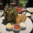ARTICHAUT, Artischocke im Ganzen gegart mit Knoblauchbrot und Vinaigrette hatte sie sich geordert. Und schon mit diesem eigentlich simplen Angebot in der festen Karte hebt man sich von fast allen irgendwie französische Anklänge im Namen nutzenden weiteren gastronomischen Angeboten im Münsterland ab. Besorge dir eine anständige bretonische Artischocke, koche sie in einem Sud aus Salzwasser mit Zitronensaft, serviere sie mit einem einfachen Dip (meine Frau hätte auch einfach eine Vinaigrette noch besser gefunden als die drei servierten Dips), leg anständig geröstetes Brot dazu und blicke in die zufriedenen Gesichter von Herrn und Frau Carsten1972! Wie auch immer, die Küche hatte sogar das Heu aus der Artischocke entfernt, meine Frau konnte einfach alle Blätter weg zutzeln und den Boden verspeisen. Ich blicke ein bisschen neidisch, bis ich mich meinem Teller widmete.