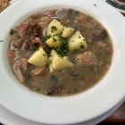 Als Vorspeise gab es eine Erzgebirgische Kartoffelsuppe (8,50 €) mit Graupen, Waldpilzen, Wurzelgemüse und hausgebackenem Pfannenbrot (eine Art dicker Fladen). Sehr lecker, natürlich und ohne die berüchtigten Helferlein.