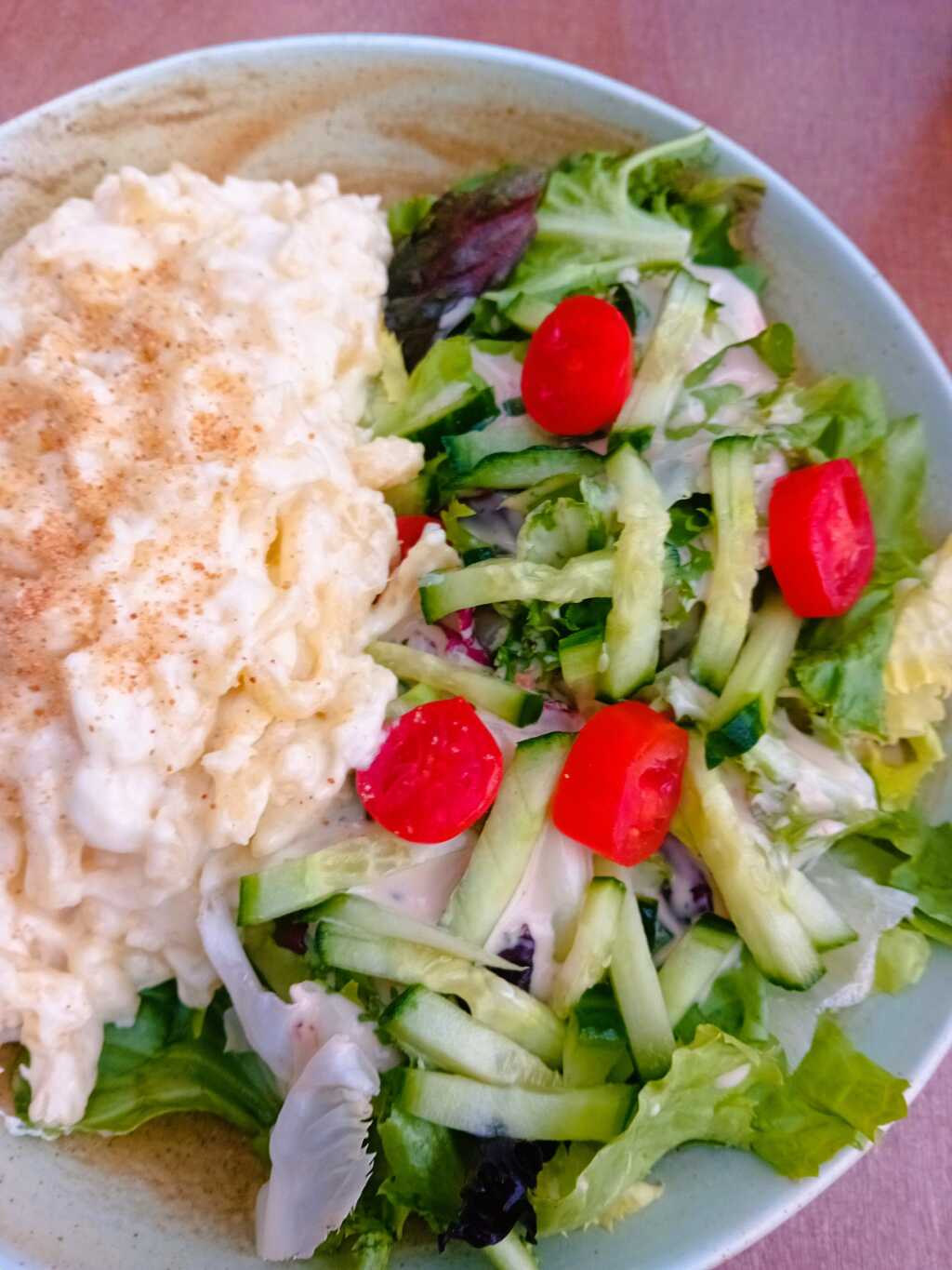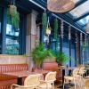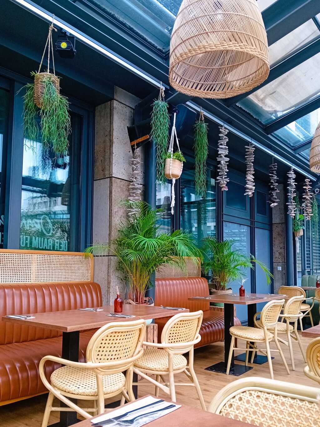 Beim Eintreten erst mal leichte Irritation. Rechts eine loungeähnliche Sitzlandschaft, vor mir eine unbesetzte Theke, daneben eine schmale Treppe. Die ich dann doch erwartungsfroh hinaufsteige. Oben ein grosser Raum mit vorgesetztem Wintergarten, alles im gefühlten Kolonialstil: viel Holz und Pflanzen, Rattanstühle mit Korbgeflecht, wild gemusterte Tapeten, exotische Deko, Makremee-Blumenampeln. Eine junge Servicedame nimmt mich von einem Nebenraum aus sofort wahr.