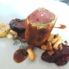 Das Fleisch war tatsächlich geschmort worden – im Sous-Vide-Verfahren gegart und leicht gebraten. Es war gut gewürzt und gar nicht besonders weich, sondern hatte noch leichten Biss. Die Sauce überzeugte mich wiederum. Das Röllchen habe ich nicht ganz „verstanden“: Die Mitte bildete ein Stück Maiskolben, der rundum einige Körner, die relativ hart waren, aufwies. Obenauf befand sich eine Haube aus Käse, die nochmals mit einer eigenen dunklen Sauce bedeckt war. Diesen Teil habe ich als gelungen gefunden und gerne verspeist; den Kolben konnte ich nicht entkernen – vielleicht hätte man ihn abnagen können, aber dafür war das Stück in meinen Augen auch zu winzig. Die kleinen Pilze wiederum haben mich völlig überzeugt. Die Pflaumenstücke hätte ich nicht gebraucht, aber sie störten auch nicht. Das Püree war gut abgeschmeckt.