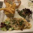 Dieser angenehme Riesling begleitete mein Hauptgericht. Schweinerückensteak Villa Westerberge Deluxe „au four“, sous vide gegartes Schweinerückensteak mit Kalbsragout und Käse überbacken, Bohnenbündchen, Pommes frites und Salatbouquet.