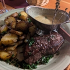 Da entschied ich mich doch glatt für Bratkartoffeln und Pfefferrahmsauce. Viermal wurde das auf Wunsch gegrillte Stück aus dem Rinderrücken an unserem Tisch geordert. Manch einer tat es mir nach und wählte auch die knusprigen Kartoffeln aus der Bratpfanne.