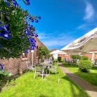 Parkplätze gibt es reichlich in Fußnähe. Das Restaurant ist schlicht eingerichtet mit Holztischen und farbigen Sesseln die sehr bequem sind und dem Raum ein bisschen Farbe verleihen. Zwei große Wandbilder lockern den Raum weiter auf. Es gibt reichlich Sizplätze innen (ich schätze mal 60 Stück) und außen weitere 30-40 Plätze. Der Außenbereich ist sehr gemütlich gestaltet mit großen Sonnenschirmen und modernen Stühlen. Eine Kegelbahn gibt es auch.