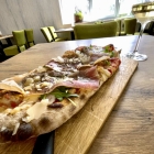 Ich bin an sich so garnicht der Pizzafan und so bestellte ich eine Pinsa Parma (die kleine Variante der Pizza) mit Mozzarella, Parmaschinken, Rucula und Parmesan für 11,50, Wasser 2,50 und 0,1 Weißwein für 2,50. Die Pinsa kam knusprig, fluffig auf einem Holzbrett mit einemSägemesser daher und war reichlich belegt mit Parmaschinken und Parmesanspänen. Die beiden jungen Männer waren sehr zuvorkommend, fragten auch wie es geschmeckt hat.